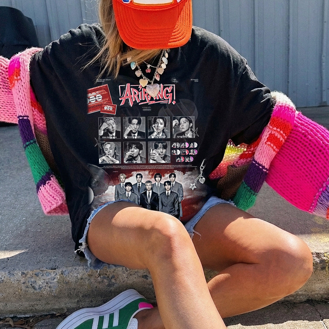 BTS Arirang 5th Album Vintage Fan Tee | All Members Photo Card Graphic Shirt | Dark Washed Kpop Merch